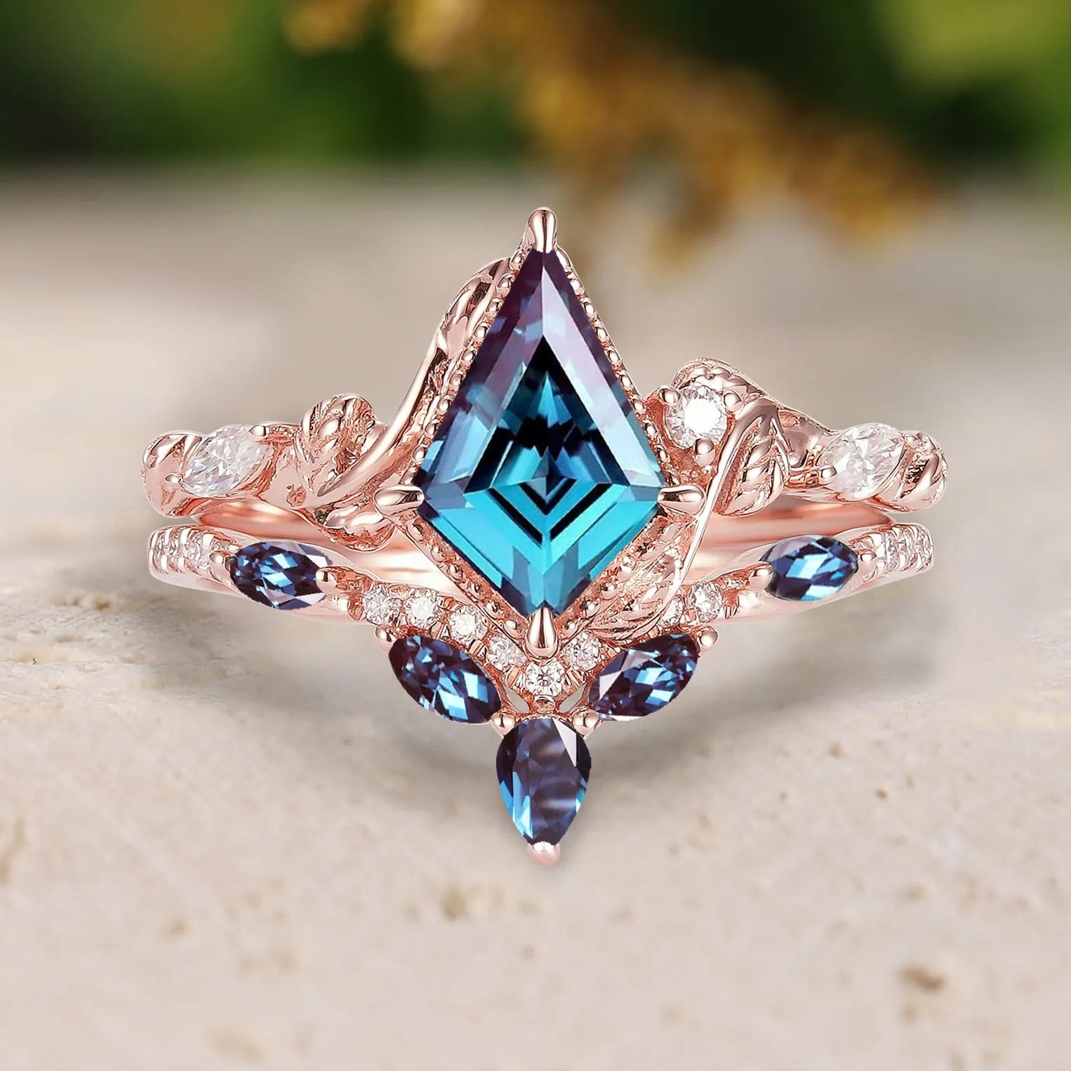 Pear Moss Agate Vintage Engagement Ring with Moissanite Stacking Band 2pcs
