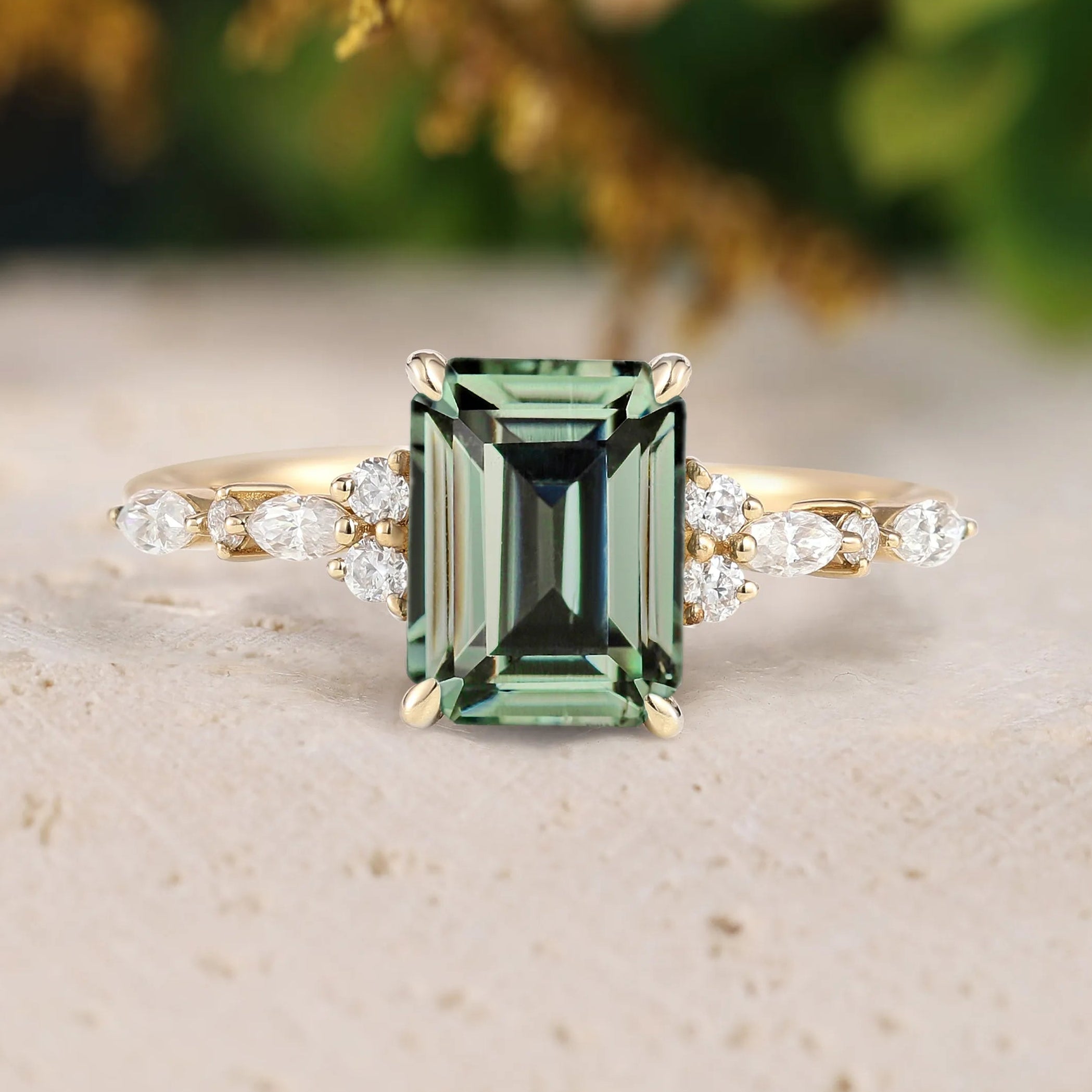 Emerald Cut Moss Agate Promise Ring with Moissanite