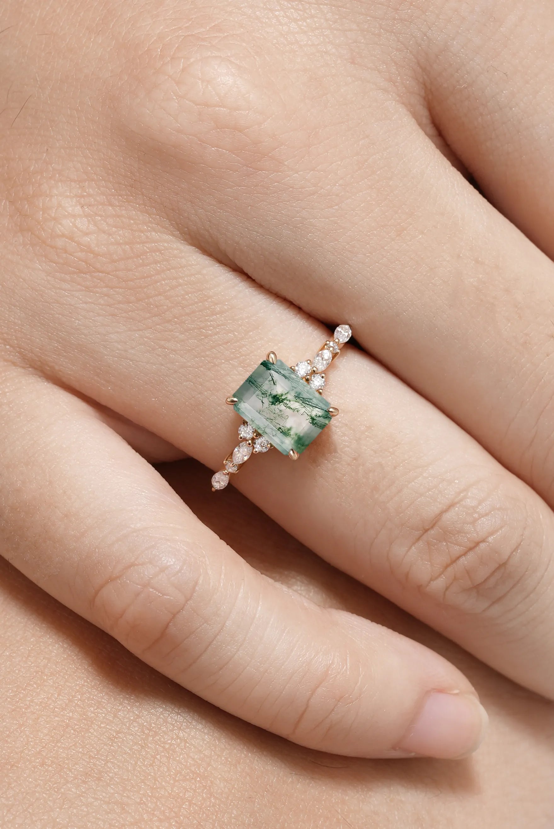 Design – An emerald-cut moss agate takes center stage, accented by sparkling moissanite stones along the band. The geometric elegance of the emerald cut combined with the organic beauty of moss agate creates a timeless, nature-inspired promise ring.