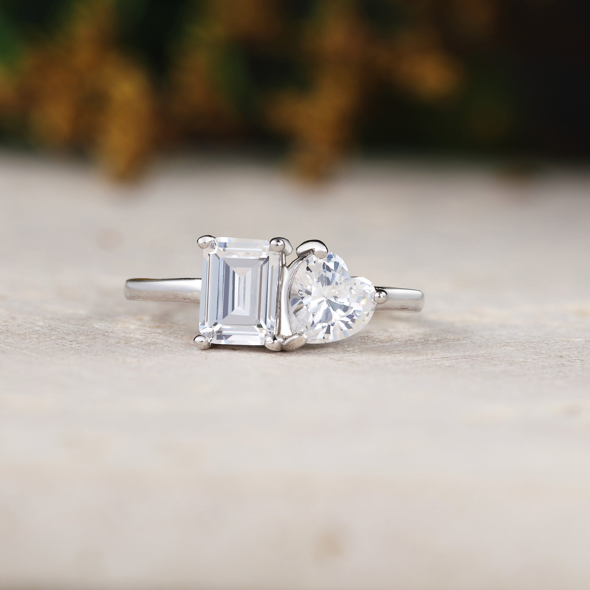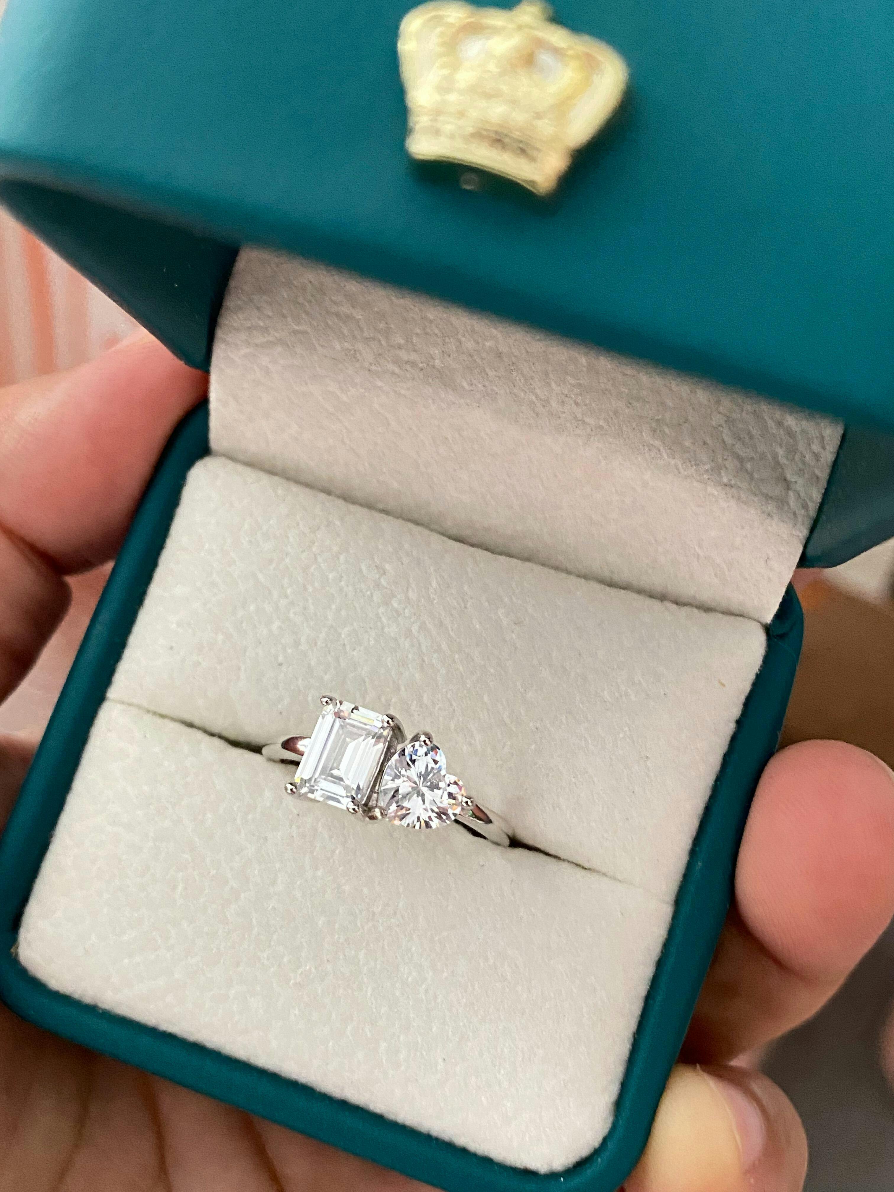 Design – This captivating You & Me engagement ring features two stunning Moissanite stones, one with an elegant emerald cut and the other with a romantic heart cut. Each stone represents the individual birthstones of both partners, symbolizing their unique journey and deep connection. The distinct cuts reflect the individuality of each person, while together they create a harmonious and lasting bond.