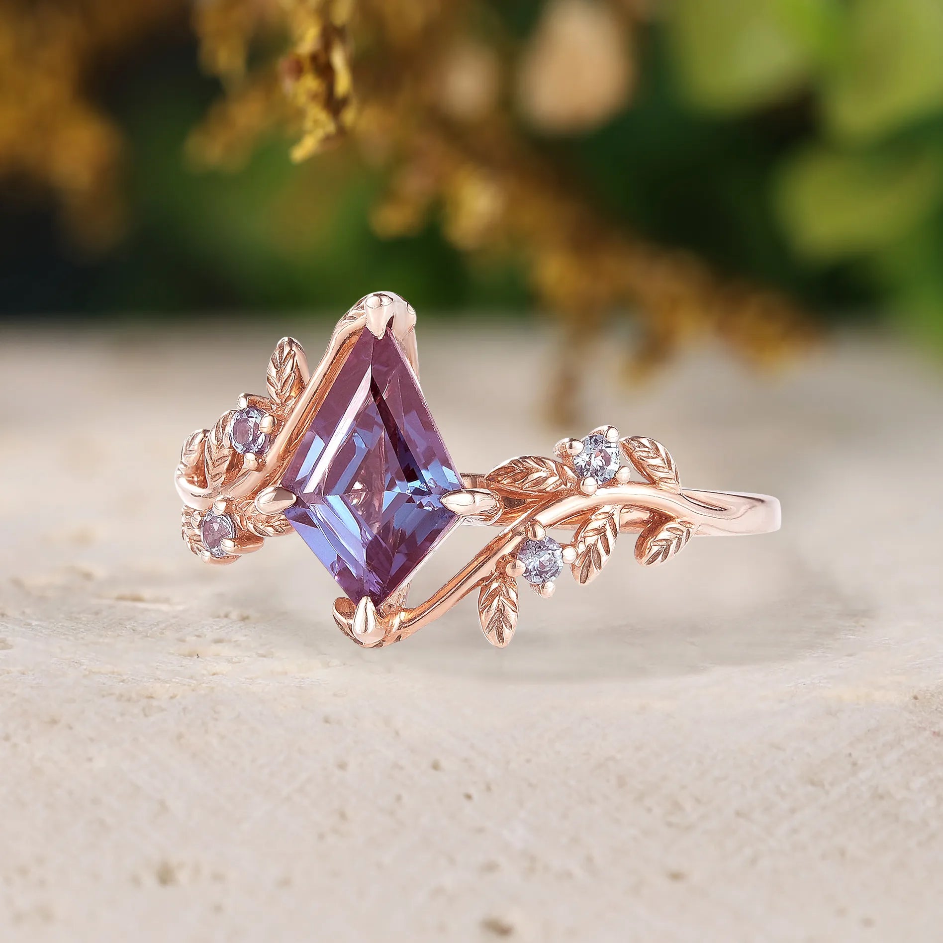 Kite Shaped Alexandrite Nature Inspired Promise Ring with Leaves