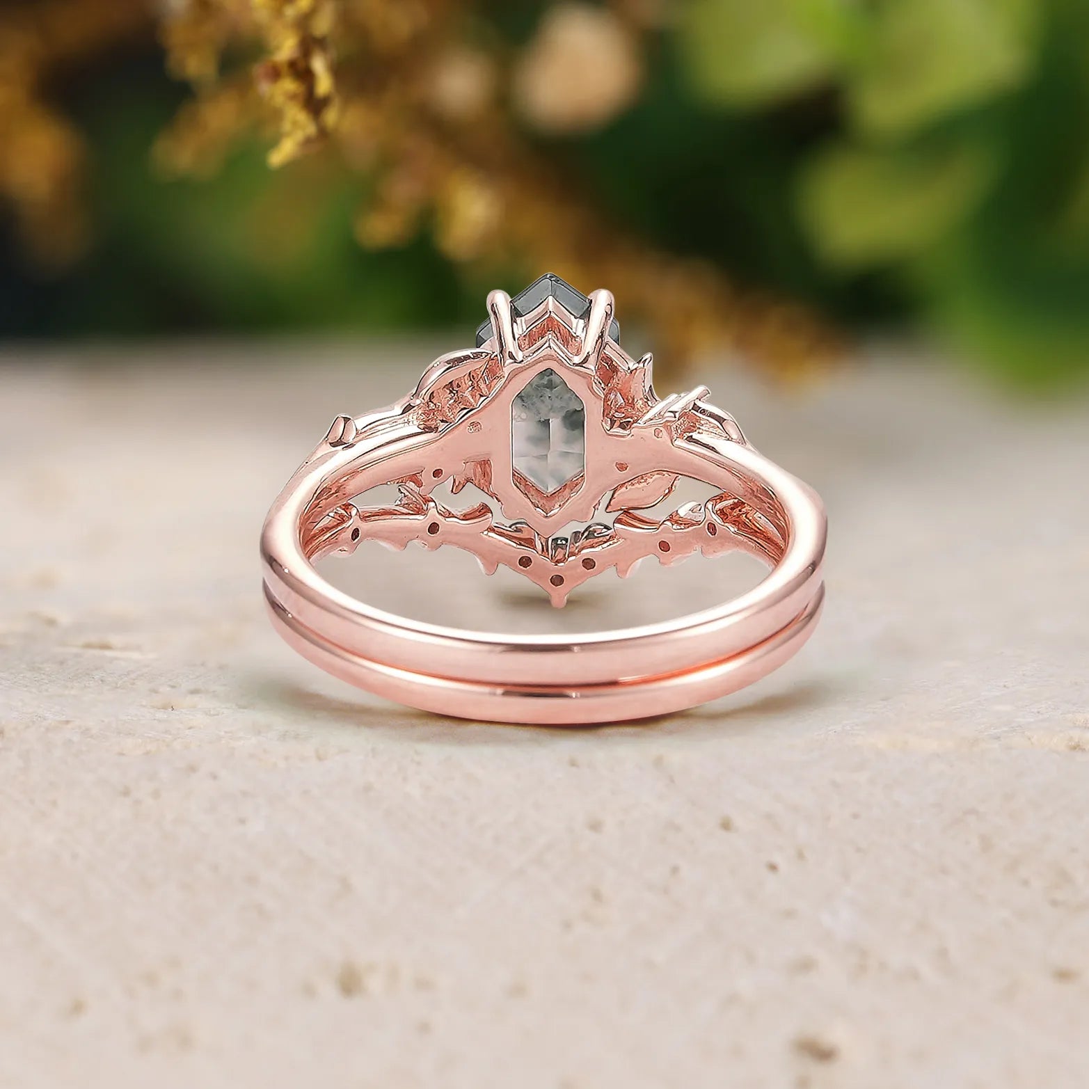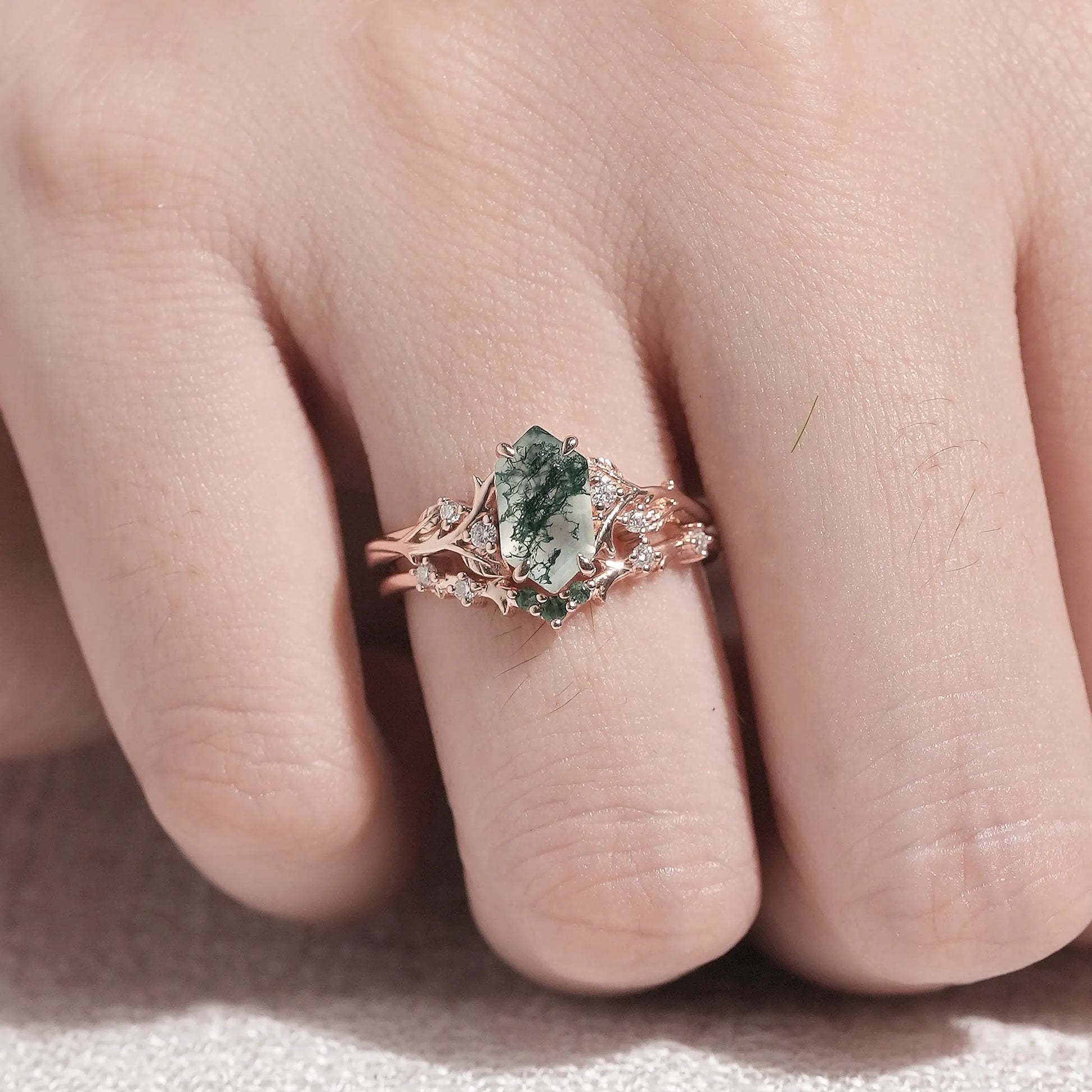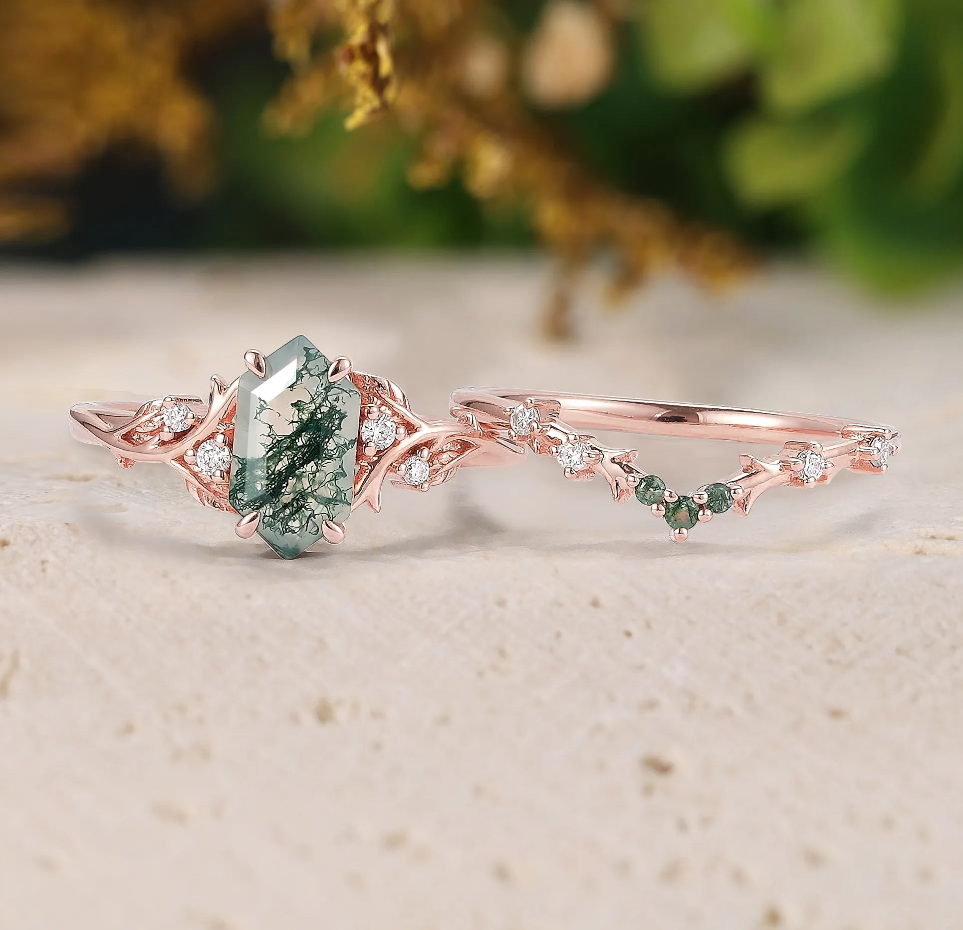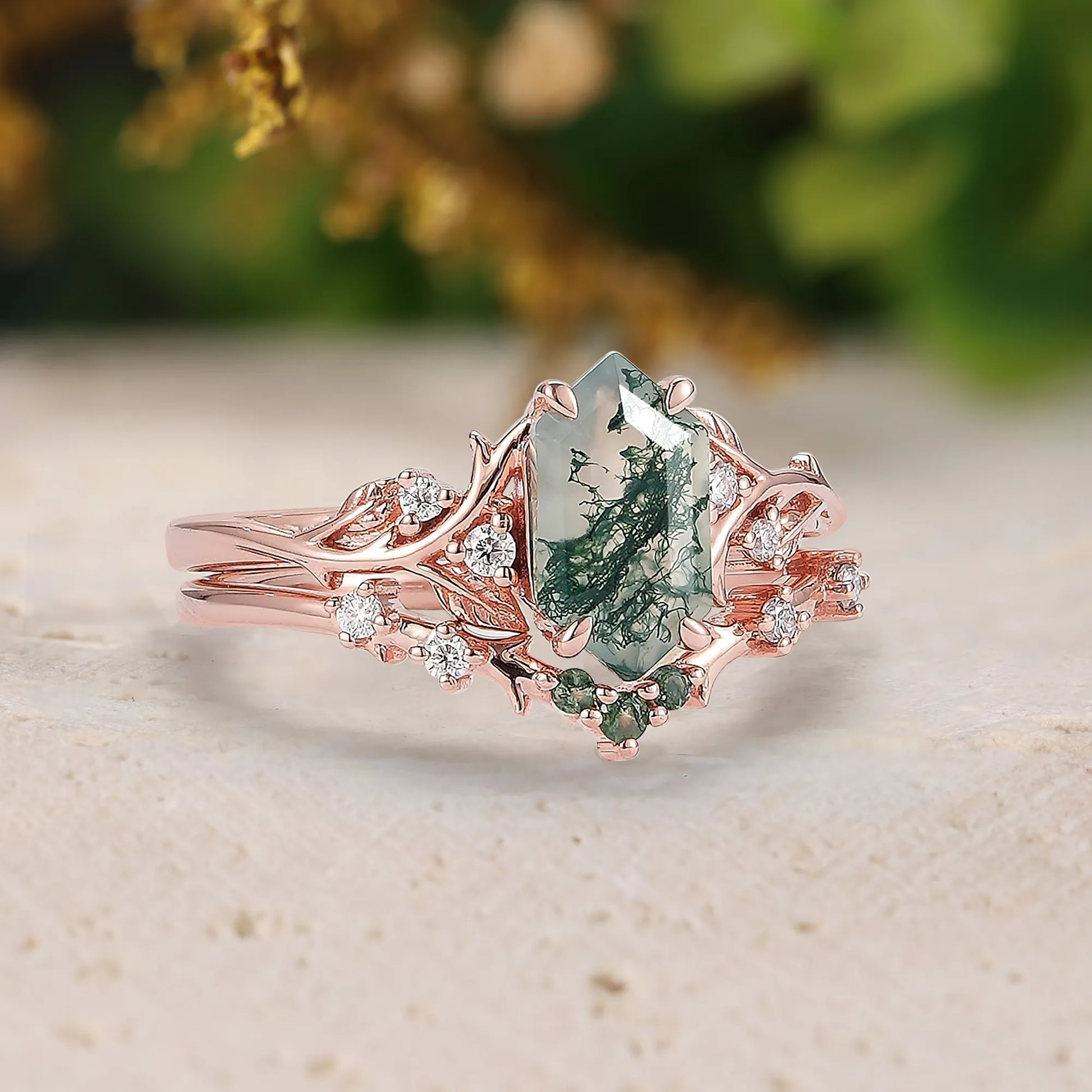 Design – A long hexagon-cut moss agate takes center stage, complemented by a delicate 2-piece bridal set adorned with leaf-inspired accents. The design combines organic elegance with a modern bridal aesthetic, highlighting the natural inclusions and unique patterns of the moss agate.
