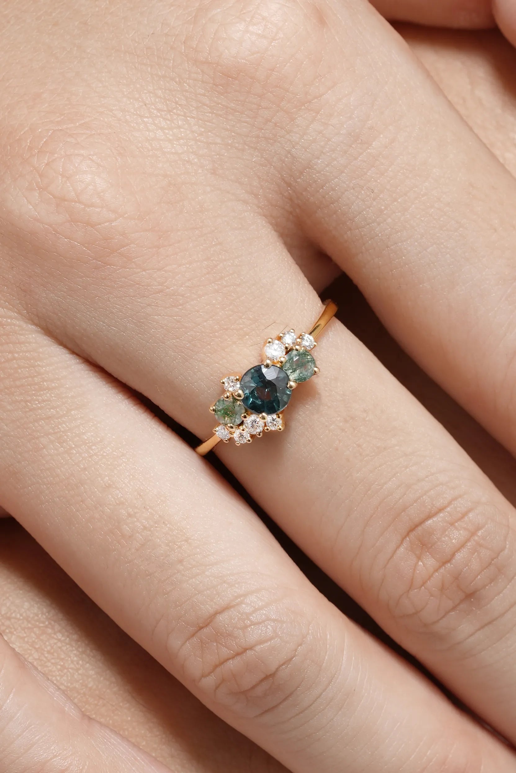 Design – A natural teal sapphire glows at the center, framed by a cluster of moss agate and moissanite accents. The mix of cool teal, organic inclusions, and radiant sparkle creates a unique design that feels both modern and deeply symbolic.