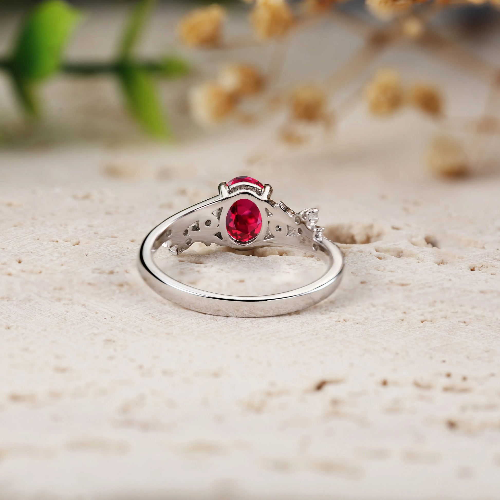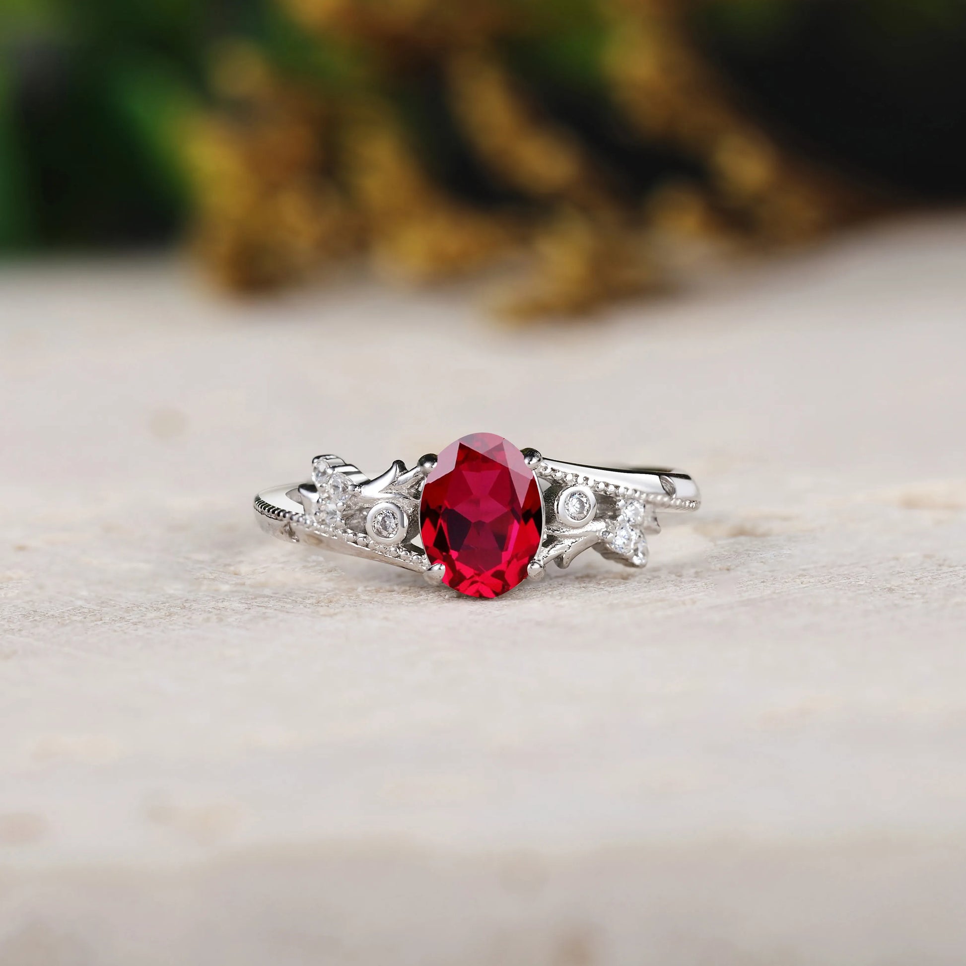 Oval Lab Ruby Engagement Ring with Vintage Beaded & Branches