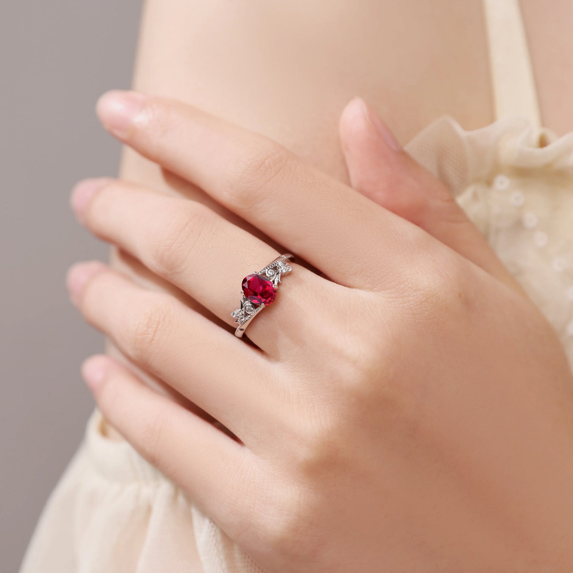 ⟢ Ring Style: This enchanting engagement ring features a deep red oval lab-grown ruby, symbolizing passion and love. The center stone is gracefully set in a nature-inspired design, with delicate branch-like details that wrap gently around the band. A vintage beaded edge adds timeless charm, giving the ring an heirloom feel.