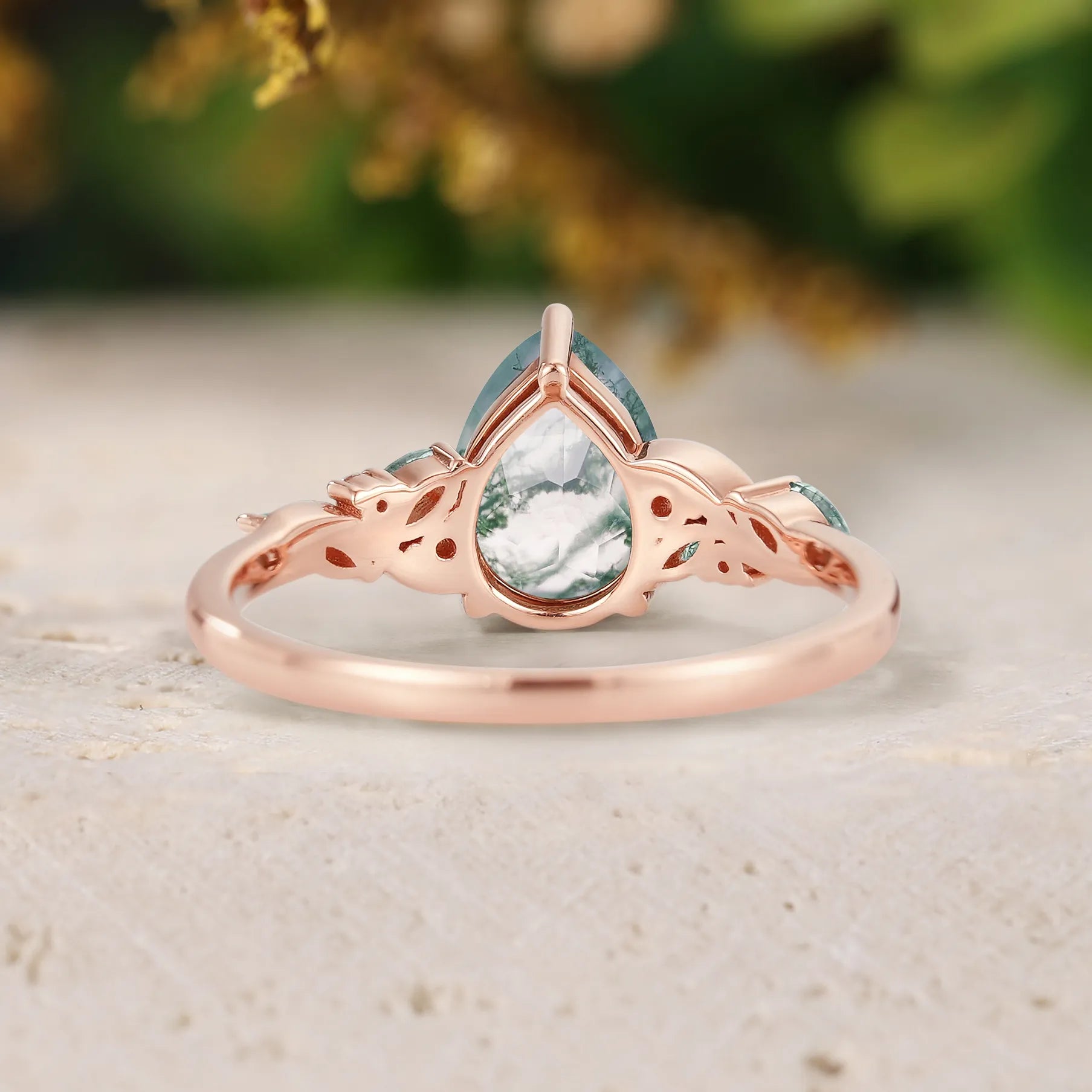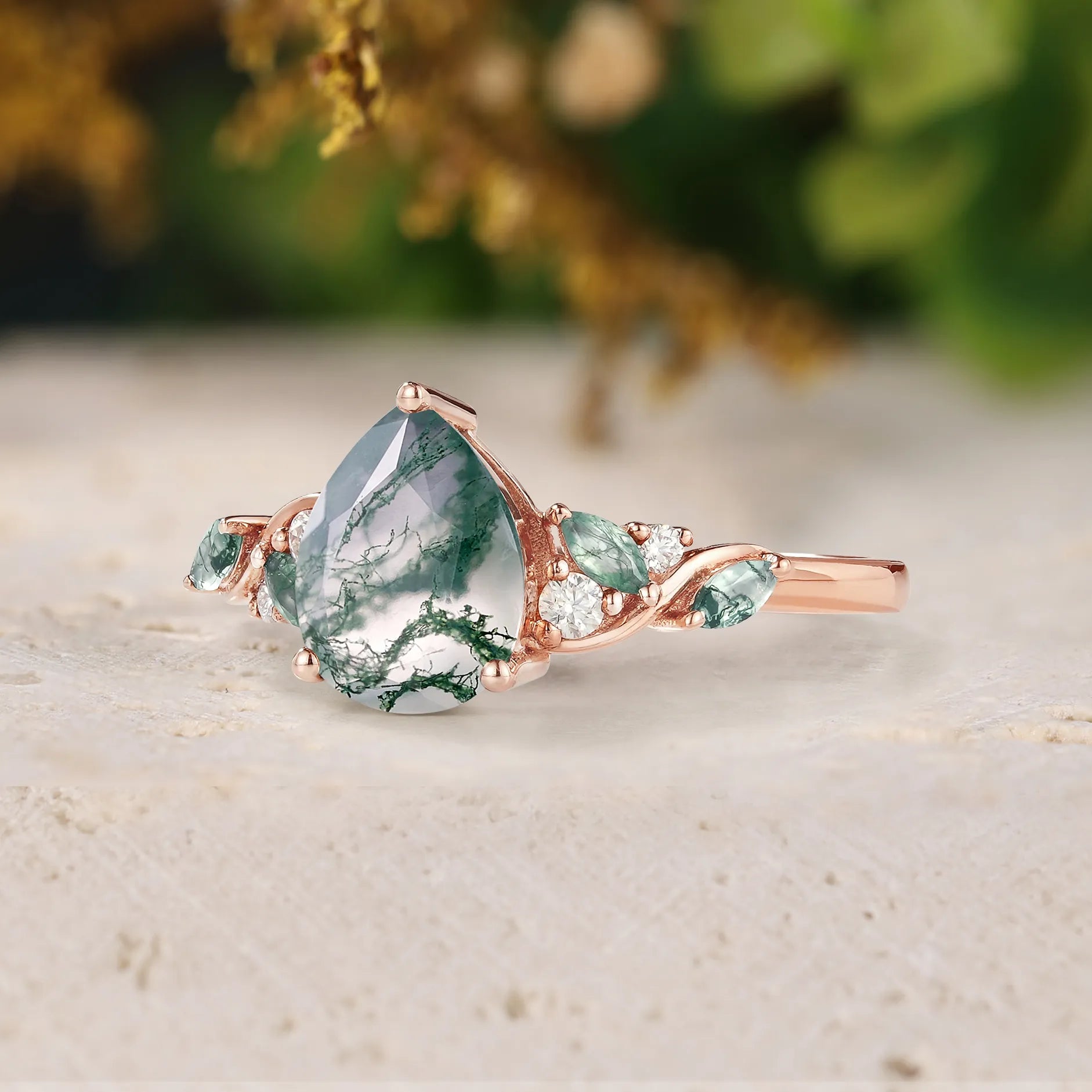 Unique Design Pear Cut Moss Agate Engagment Ring